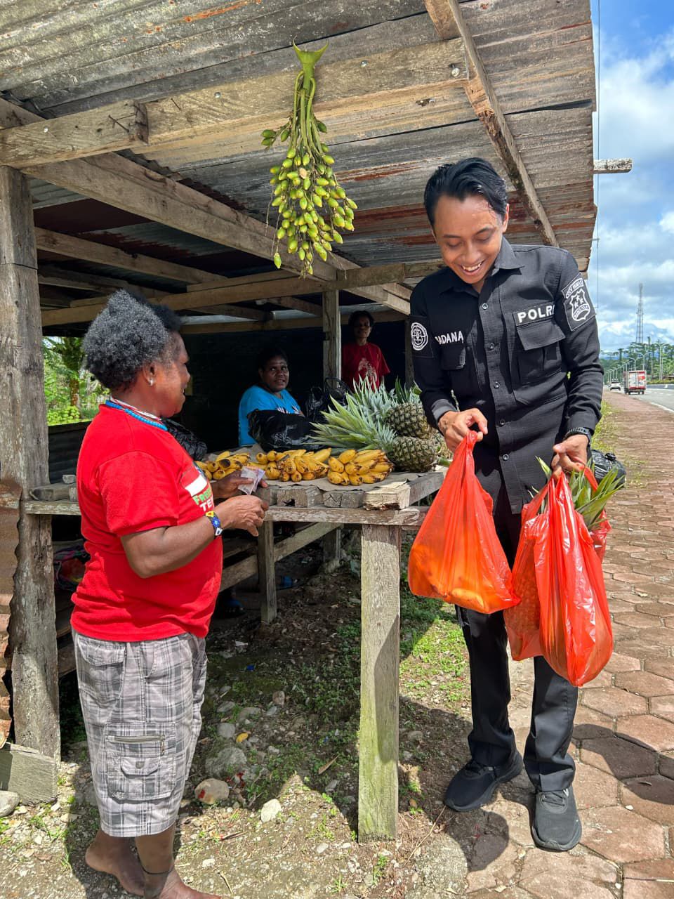 TBnews, Timika — Pendekatan humanis terus menjadi bagian dari upaya menjaga stabilitas keamanan dan membangun kepercayaan masyarakat di Papua. Hal tersebut ditunjukkan melalui kegiatan sederhana namun bermakna yang dilakukan Personel Satgas Humas Ops Damai Cartenz Iptu I Gde Pradana Sthirabudhi, S.Ds., dengan berbelanja buah lokal milik mama-mama Papua di Jl. Agimuga Mile 32, Timika, Jumat (19/12/2025).