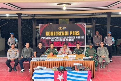 TBnews, NABIRE — Aparat gabungan TNI-Polri menggelar konferensi pers terkait perkembangan upaya penegakan hukum terhadap target daftar pencarian orang (DPO) kelompok kriminal bersenjata (KKB) di Kabup...