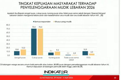 TBnews, Jakarta – Indikator Politik Indonesia merilis hasil survei terbaru yang menunjukkan tingkat kepuasan publik terhadap penyelenggaraan Mudik Lebaran 2026 berada pada level sangat tinggi. Sebanya...