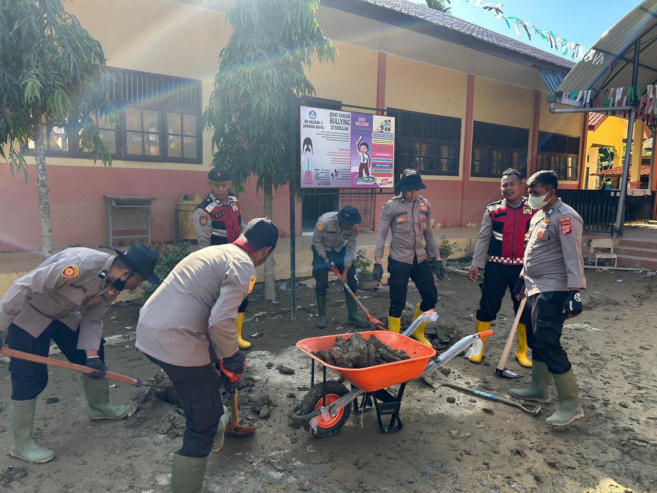 Di waktu yang sama, Polres Pidie Jaya dan Polsek Jangka Buya bersama masyarakat melaksanakan Bakti Sosial Pasca Banjir Bandang di Mesjid At-Taqwa dan SD Negeri 1 Jangka Buya, Gampong Leurui Mangat.