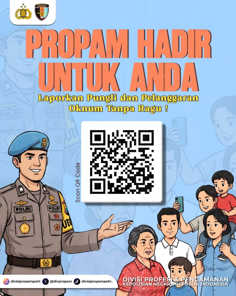 Selain melalui QR Code, masyarakat juga dapat mengakses kanal resmi Divisi Propam Polri di media sosial, seperti Instagram @divisipropampolri, X (Twitter) @divpropam, dan akun TikTok divisipropampolri_, untuk mendapatkan informasi dan kanal pengaduan resmi lainnya.
